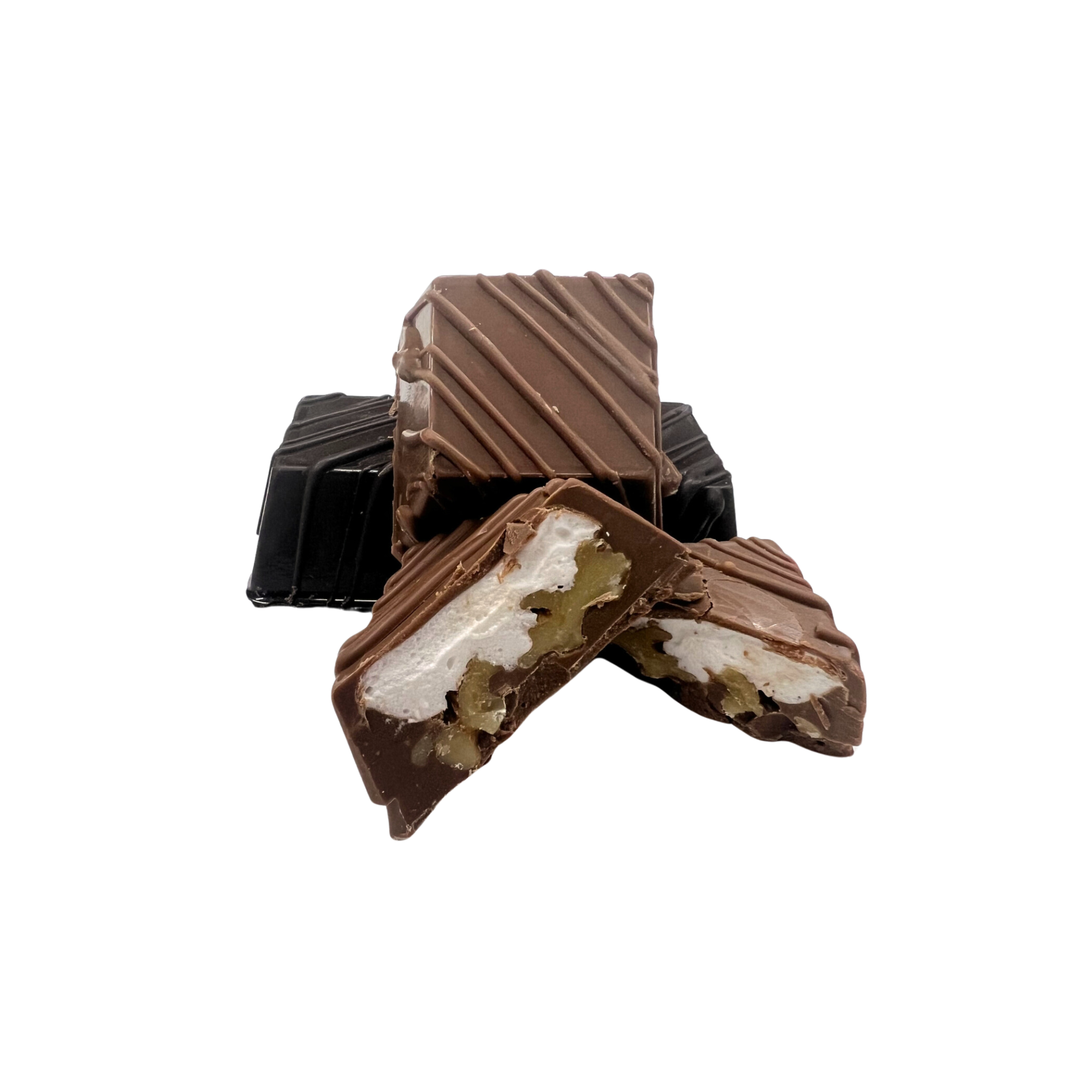 Our Heavenly Hash is made with small cuts of vanilla marshmallow and walnuts mixed into milk or dark chocolate.